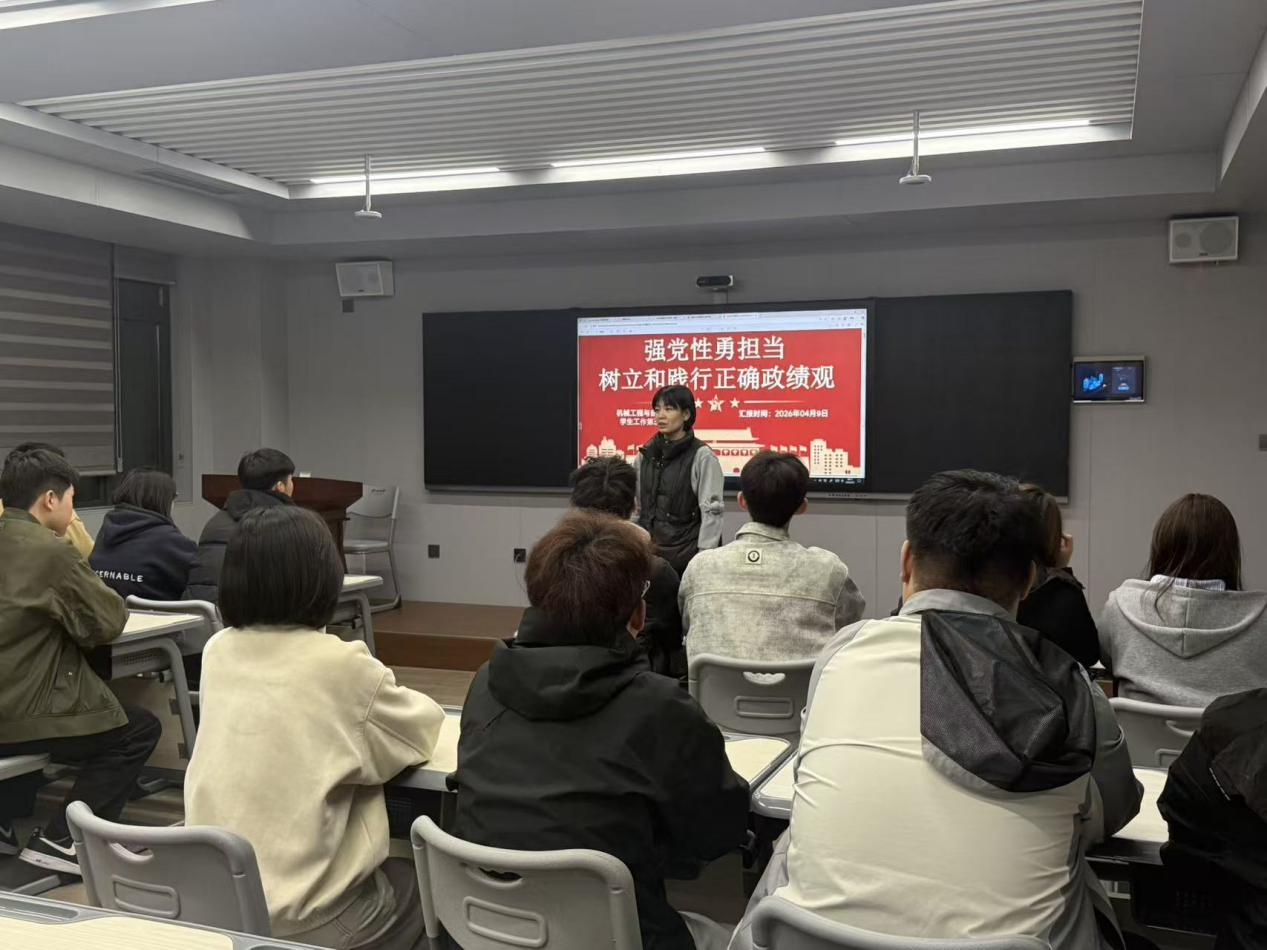 2026-04-10为深入学习贯彻习近平总书记关于树立和践行正确政绩观的重要论述,落实相关学习部署要求,进一步强化党员的党性修养和责任担当,4月9日,机械工程与自动化学院学生工作第三党支部在机械楼开展“强党性勇担当,树立和践行正确政绩观”主题党日活动。党支部书记王晶同志主持会议。活动伊始,党支部严格执行“第一议题”制度,支部书记王晶组织全体党员深入学习《习近平关于树立和践行正确政绩观论述摘编》,结合我校实际,深入解...