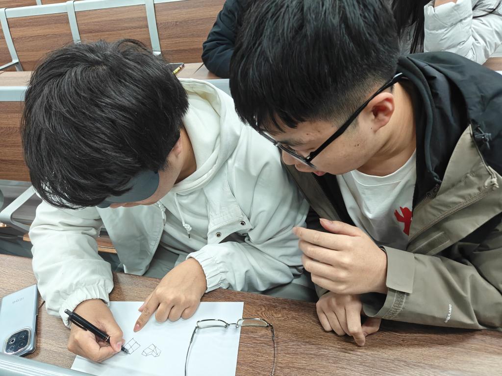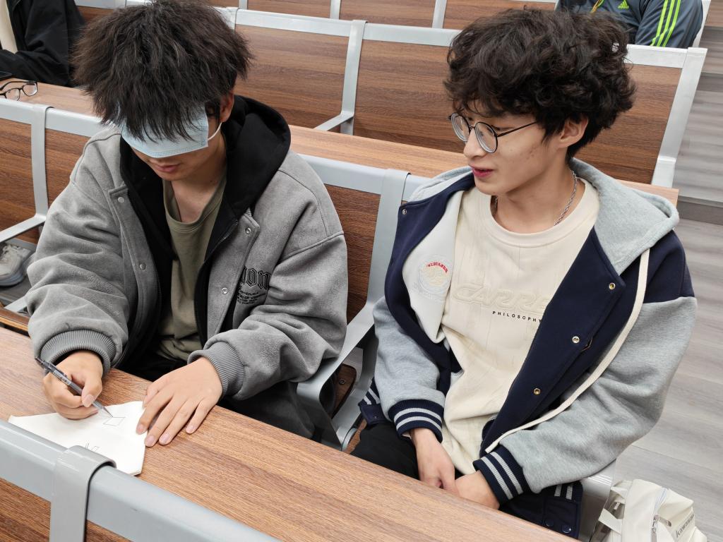 告别枯燥的交流模式,盲画信任游戏以两人小组为单位展开,一人化身 “指挥者”,仅靠精准的语言描述指引作画,一人成为 “蒙眼作画者”,全程依靠同伴指令完成创作。在这个过程中,同学们放下顾虑,全身心依赖同伴,让心与心的距离在一句句指引、一笔笔绘画中不断拉近。