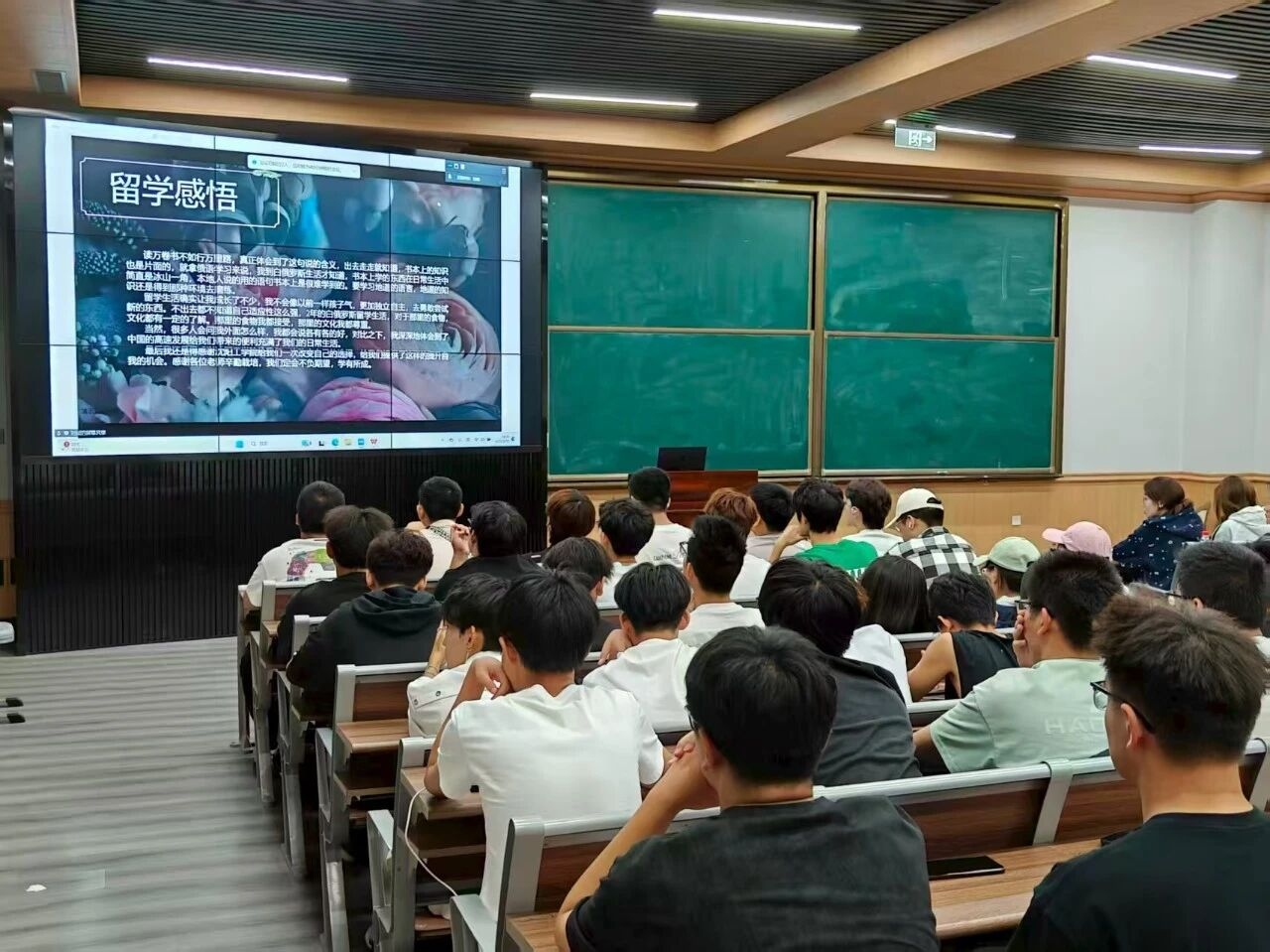 随后,21机制中白精英班的刘斌同学从课堂学习与课余生活两方面展开,提及白俄罗斯真实语言环境对俄语学习的重要性,课本知识远不及当地日常用语实用。他还展示了公园小景、师生互动及独立日活动等场景,展现多元的留学生活。刘斌表示,两年留学让他更独立,也深刻体会到中国的高速发展给留学生带来的便利。他感谢学校提供的宝贵机会,承诺会学有所成。通过他的分享,也让大家深刻体会到“行万里路”的重要意义。