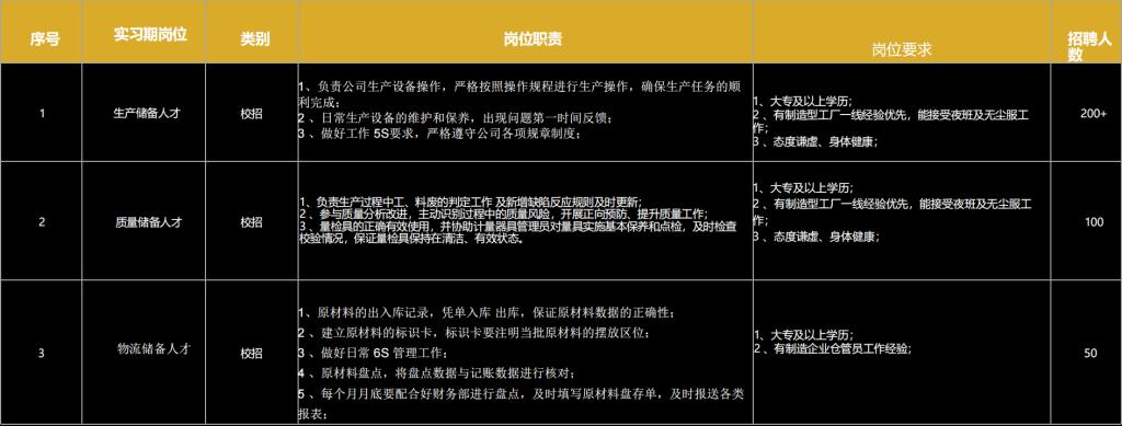 2 质量储备人才 校招 缺陷判定、质量改进、量检具管理 大专及以上,可接受夜班/无尘服,细心负责 100
