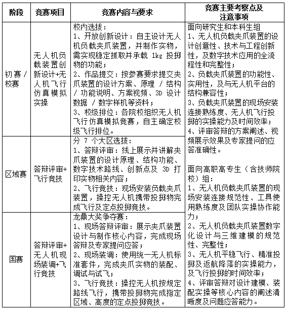 因此,赛事紧扣国家低空经济发展战略与产业人才需求,以无人机负载装置的数字化创新设计、增材制造、安装调试、虚拟仿真与无人机操控等真实应用场景为核心,旨在培养大学生创新创造精神与实践能力,提升大学生的创新设计与实践动手等能力,携手打造具备数智素养,有创意想法、有创新能力、有创造精神、有创业思维的新质人才。同时搭建产学研用深度融合的赛事平台,促进创新链、产业链、教育链、人才链的深度融合,以教育、科技、人才的良性循环赋能新质生产力高质量发展。现将有关事项通知如下: